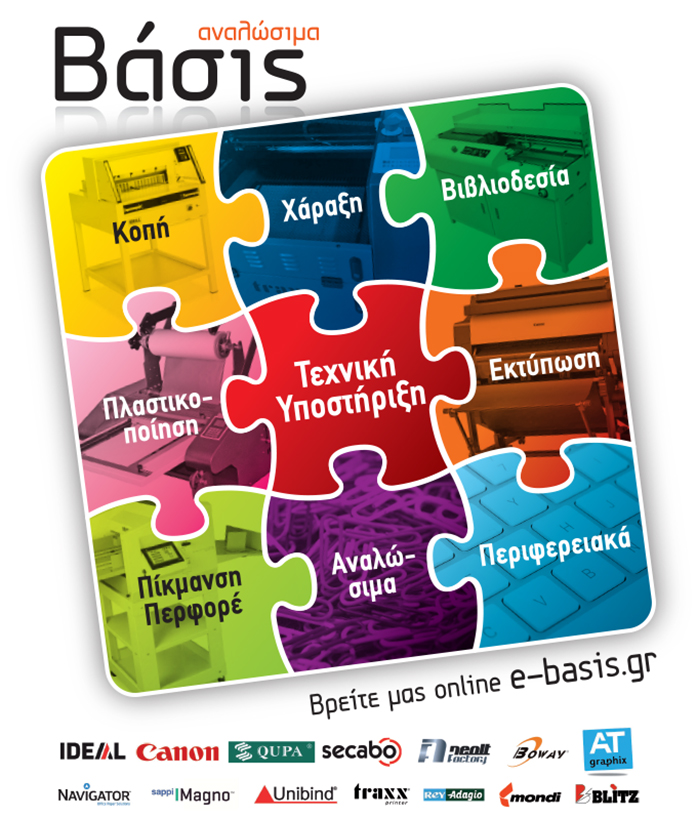 H ΒΑΣΙΣ είναι εισαγωγική εταιρία που δραστηριοποιείται στους κλάδους των γραφικών τεχνών, αναλωσίμων και μηχανών γραφείου και προσφέρει ολοκληρωμένες λύσεις στη σύγχρονη επιχείρηση.