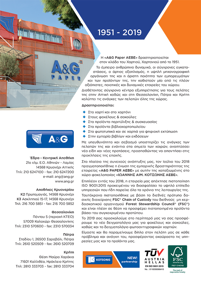 Ανώνυμη Εμπορική και Βιομηχανική Εταιρεία Εμπορίας και Επεξεργασίας Χάρτου 21ο χιλ. Ε.Ο. Αθηνών-Λαμίας, Κρυονέρι Αττικής Τηλ: 2106247100 Fax: 210 6247200 AnG@AnG.gr www.AnG.gr