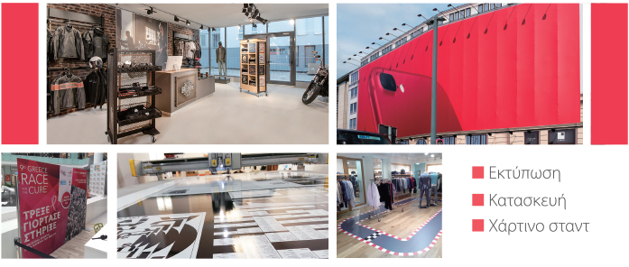 Ανάμεσα στις προσφερόμενες εκτυπωτικές υπηρεσίες μας ξεχωρίζουν οι εκτυπώσεις banner για κάλυψη κτιρίων, η εκτύπωση αυτοκόλλητων για ταπετσαρίες, βιτρίνες ή εκθεσιακά περίπτερα , η εκτύπωση σκηνικών θεάτρου, η σήμανση καταστημάτων, οι ειδικές κατασκευές όπως χάρτινα προωθητικά σταντ ή κατασκευές από ειδικά υλικά τύπου reboard, kappa mount, forex, Etalbon για κάθε προωθητική ενέργεια.